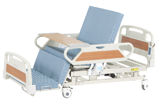 三功能床/ABS床头尾板、PP护栏、万向脚轮、餐桌板、四折聚脂纤维床垫、背部脚部整体升降。