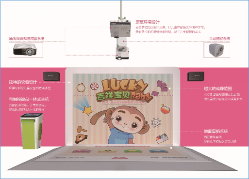 1、硬件:触摸式控制主机+高清地面短焦成像设备+高清墙面短焦成像设备+互动捕捉设备+地面震撼系统+墙面感应系统+音响设备+康复环境设计装修。